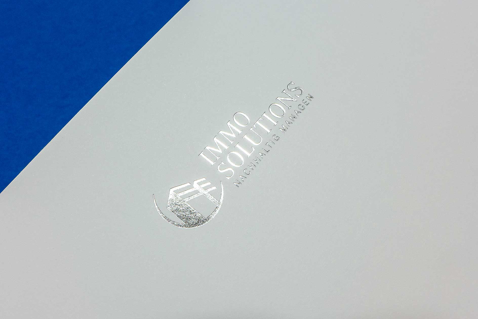 Einseitig Heißfolienprägung Streumotiv Linien und Texte in Standardfolie glänzend SILBER metallisch, flache Prägeausführung, inklusive Werkzeug. Prägemotiv Titel im obersten Viertel des Formats (Text oder Logo).