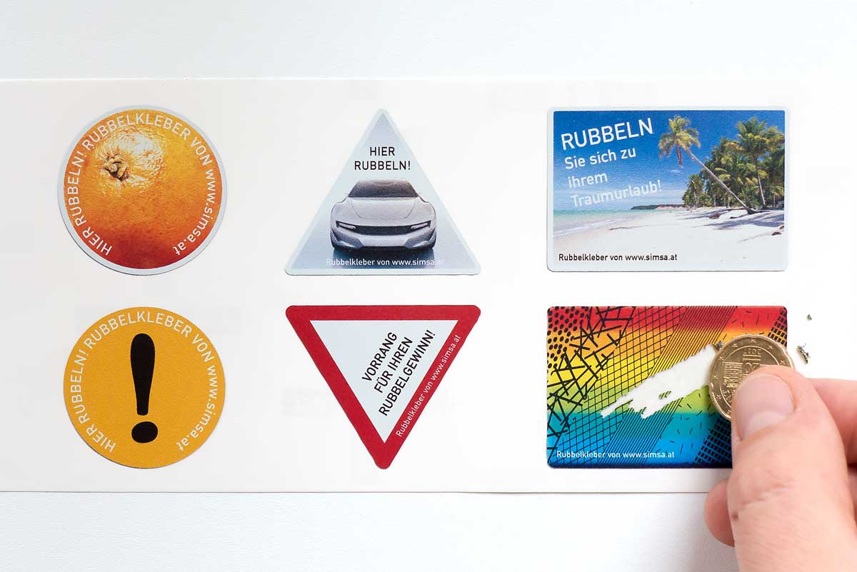 Neben den Rubbelflächen in Silber und Gold, gibt es auch das rubbelbare Foto, kurz Rubbelfotokleber, in Form von Selbstklebeetiktten: Hier ist ein buntes Foto wegrubbelbar und darunter kommt das am Papier gedruckte Bild zum Vorschein. Durch unerwartete Bilderfolgen lassen sich hier verblüffende Überraschungsmomente herbeizaubern.